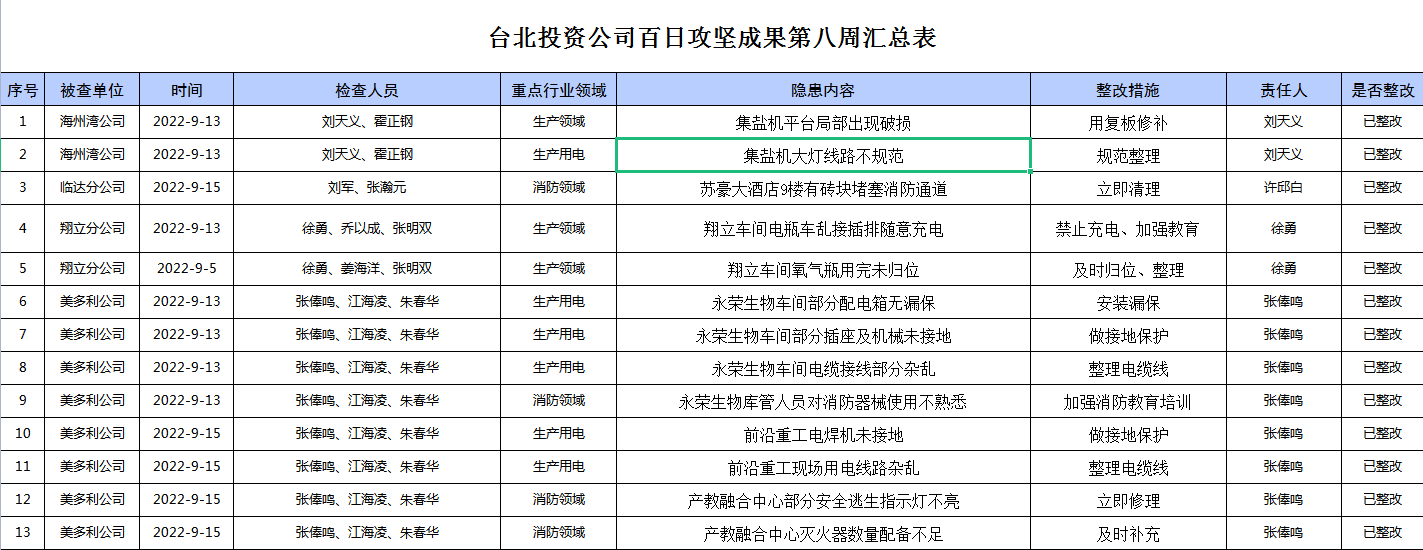 台北投资公司百日攻坚成果第八周汇总表