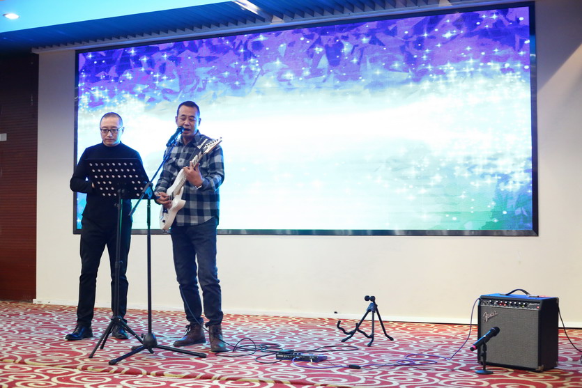 联欢会节目丰富多彩,有独唱、小合唱、魔术、游戏等。精彩的表演赢得了全场阵阵欢声笑语,虽然表演很业余,但大家各个精神抖擞,充分展示了公司员工的蓬勃朝气和奋发进取的精神。在热烈氛围的感染下,公司领导也纷纷上台表演节目为晚会助兴,杨善革《我爱你塞北的雪》对新年的祝福和期盼,表达了迎新年的喜悦心情。公司党委书记、董事长、总经理王德志一曲《南泥湾》更是唱出了公司全体员工热爱祖国,热爱企业,立志艰苦奋斗、自力更生,决战2022,打赢台北保卫战,再创台北新辉煌的决心。