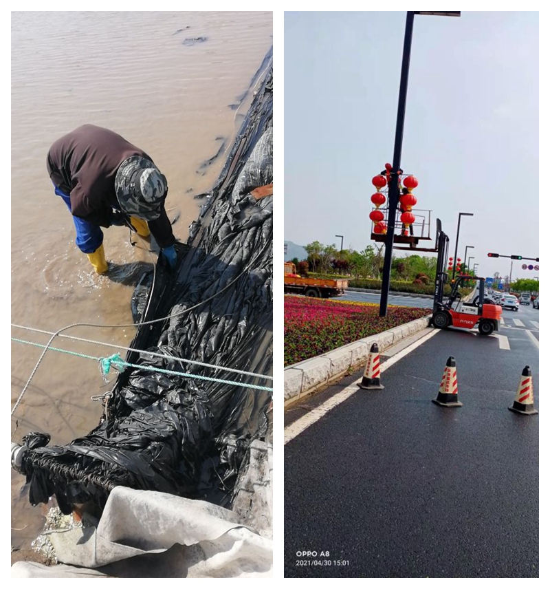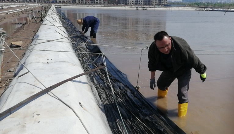 复晒滩上,昨天冰雹造将挡浪布击的千疮百孔,为了保住劳动成果,天还未亮时,翔立人就走上滩头进行抢修更换,以确保利用好天时退布复晒生产高浓度钙液,实现钙业的产销再创新高。