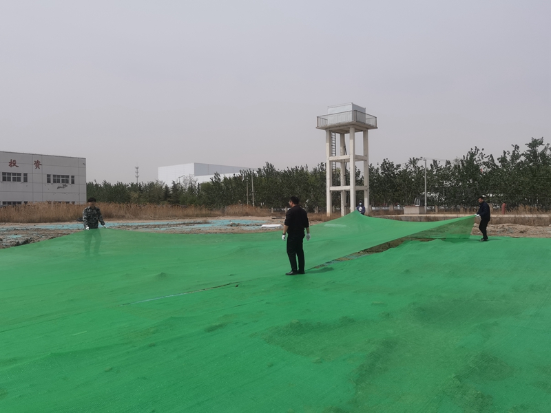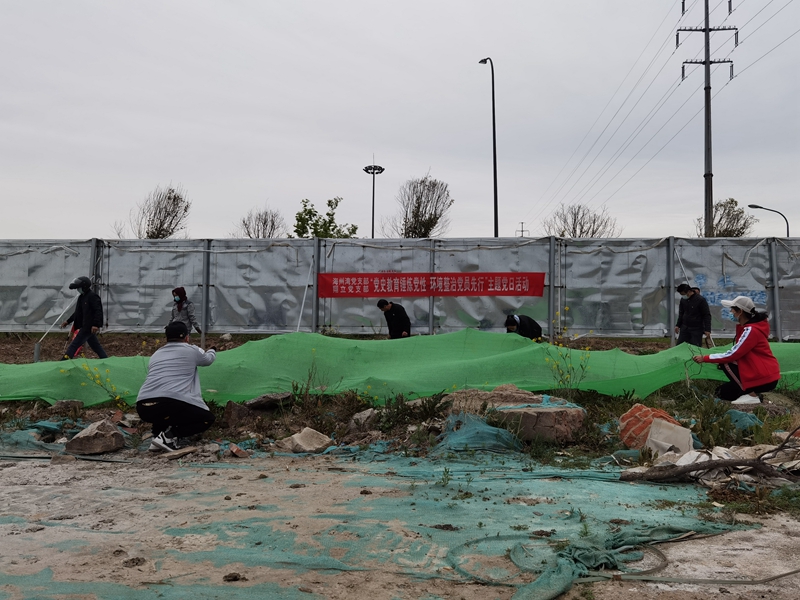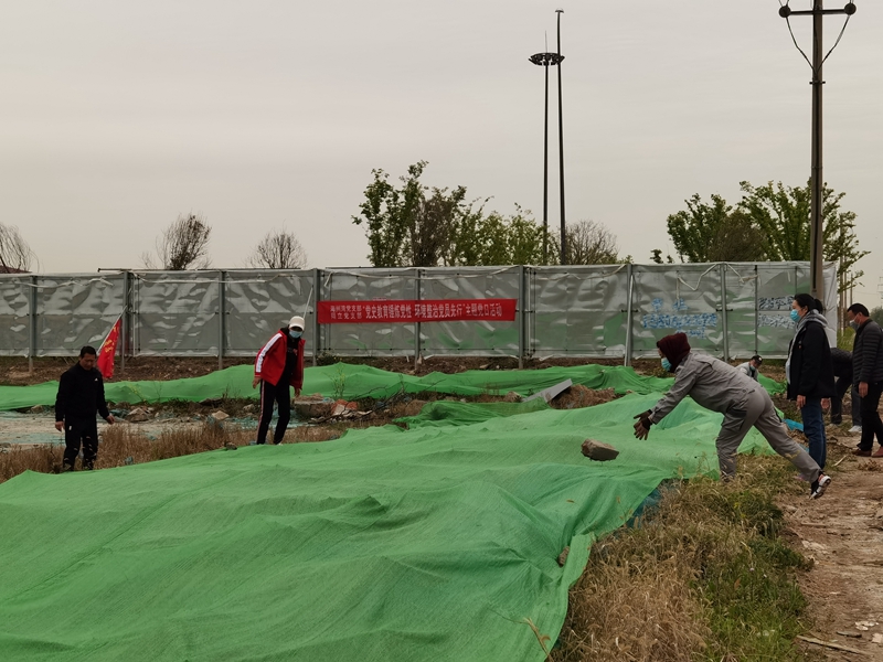 翔立分公司党支部携手海州湾公司党支部对公司的车站小滩进行环境整治,为裸露在外的土地进行防尘网铺设。