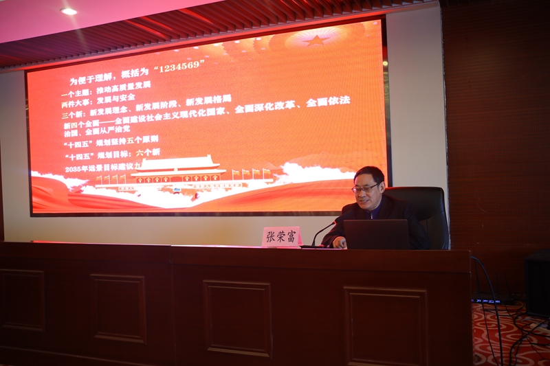 下半场,张校长从一个主题,推动高质量发展;两件大事,发展与安全;三个新,新发展理念、新发展阶段、新发展格局;新四个全面,全面建设社会主义现代化国家、全面深化改革、全面依法治国、全面从严治党;“十四五”规划坚持五个原则;“十四五”规划目标,六个新;2035年远景目标建议九项措施等九个方面解读了全会精神的“新征程 新理念 新格局 新愿景”。
