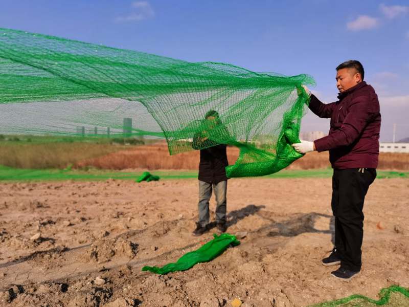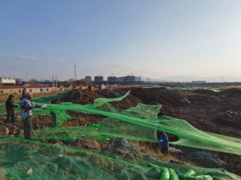 一名党员就是一面旗帜,十余处山丘上,不只是一面“党员突击队”旗,而是几十上百面的“战旗”。在鲜红旗帜的引领下,仅仅一天时间,突击队员们“冲锋陷阵”,攻克一个又一个“山头”,铺设800余张防尘网,共计200余亩裸土。
