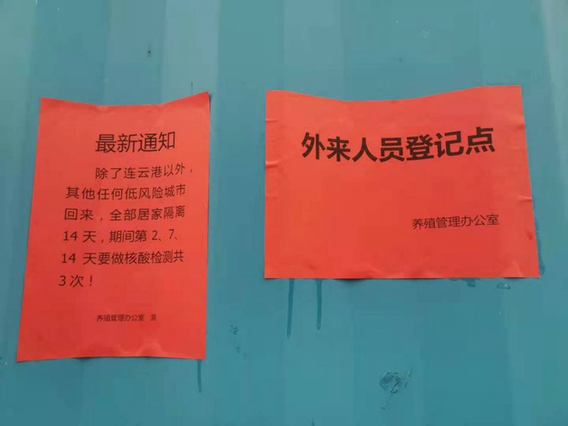 养殖管理办公室迅速反应,成立防疫领导小组,加强值班值守,设置疫情防控设置隔离点、外来人员登记点,张贴疫情动态通知。养殖办全员到“塘头”排查是否有人员与中高风险地区回连人员的接触史(包括家人和周边邻居)和疫苗接种情况;对来往车辆和人员进行逐一登记排查,宣传防疫注意事项;并要求养殖户不得雇佣除了连云港以外人员干活、不得让除了连云港以外人员或车辆在池塘进出。
