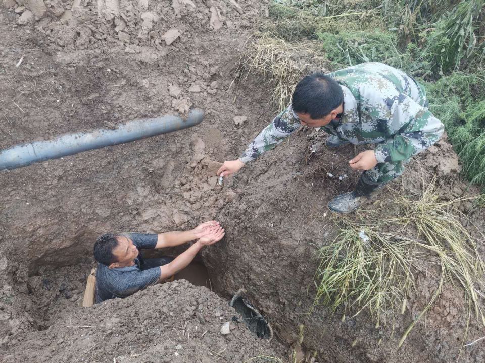 泵站是大浦工区的命脉,也是生存之源。泵站三人组席强余、乔效富、龚大春凭着敏锐的洞察力,迅速关掉阀门,带上工具,立刻出发排查检修输卤管道。由于昨夜突降暴雨,地面潮湿,给排查工作带来了相当大的困难,三人组按照多年的工作经验,当机立断,分工分路段进行排查,与时间赛跑,早点找到损坏的管道就能减少卤水的损失。经过三人精心细致的排查,徒步六公里,终于在台北汽车城一处杂草丛生的区域发现了损坏的管道,此处管道是掩埋在泥土里面,修复起来难度更大,三人立即拿起铁锨开挖,席强余顾不上管道沟里齐膝浑浊的雨水,穿着胶鞋就淌进沟里,坐骑在管道上,双手伸进水里,娴熟的进行修复。经过近两个小时的维修,管道恢复正常供卤,大程度减少了卤水损失,为原盐顺利生产提供了坚强有力的保障。