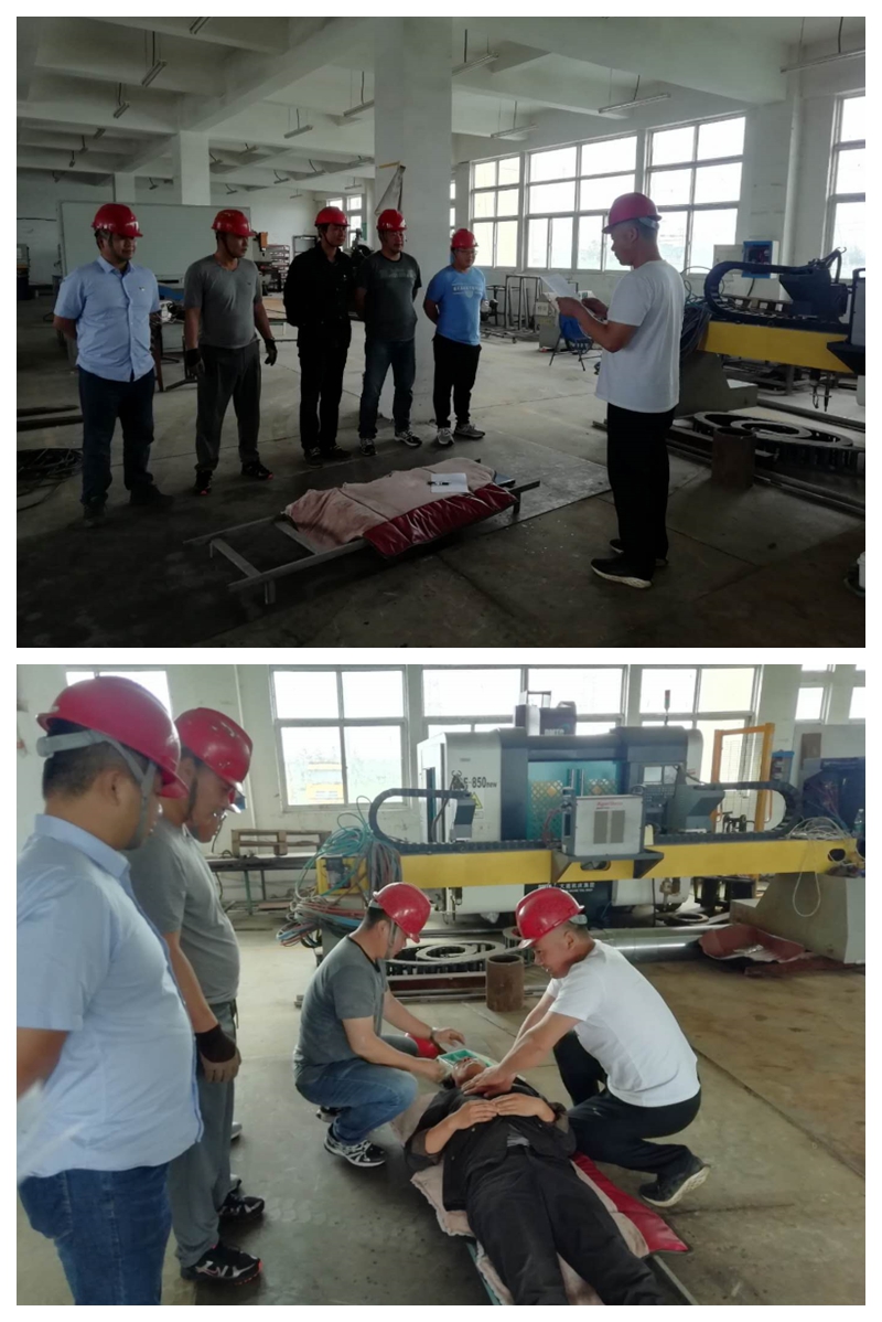 本次演练方案模拟在精工车间正常生产过程中,因对电气设备没有经常性检查,液压切板机切板时掉落的钢板未采取防范措施将电气电缆砸断搭铁,造成液压切板机金属外壳带电,作业人员在正常操作机床时造成触电事故伤害。当同事发现有人触电后,立刻做出救援反应,切断电源将触电人员安全隔离开后抬到担架上进行抢救。并同时上报应救援指挥组,指挥组迅速做出响应,启动防触电应急预案,大家按应急预案的分工迅速开展救援工作,拨打120急救电话、拉警戒线、查看伤情、紧急抢救、人工心肺复苏等,直至触电者苏醒,在大家的共同协作下演练圆满成功,翔立分公司汤占国总经理对此次演练效果进行了总结和点评。