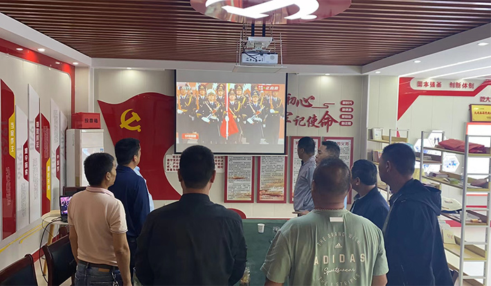 主题党日活动在国歌中拉开了序幕。资产管理中心全体党员列队面向屏幕,观看天安门广场升国旗仪式视频。