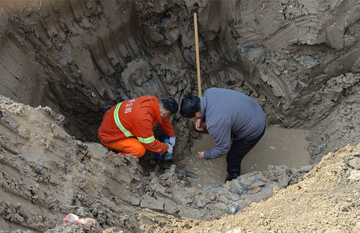 11时,已查明管道漏点处系PE63管道断裂,至于管道断裂的原因,判断是地面沉降使管道落差错位所致。抢修人员站在2米多深的泥坑里,不怕脏和累,徒手加紧管道抢修。经2个多小时紧张有序抢修,成功将断裂的水管修好。于当日下午1630分恢复供水,有力保证了辖区春季绿化浇灌工作正常开展。(王宜全、杨维军)