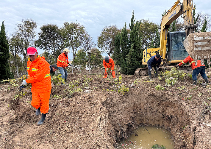 开设道口处的乔木,工人们先用高枝锯和强力剪进行紧密精密修剪,保障后期植物根部能更好的吸收,由于挖掘机太大无法操作,只能全程人工操作,工人们干劲十足45人一组,运送树苗,挖坑、栽植、回填、覆土等步骤有条不紊地进行.并且对这些新移植的苗木和乔木进行灌水和设支撑固定架,经过一天的持续奋战,累计移植50余颗大小树木。(杨雨堃)