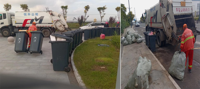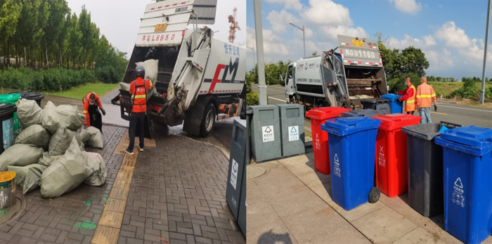 节日期间,环卫分公司每天出2辆清运车辆,随车4名环卫推桶工人、2名驾驶员,对徐圩新区住宅小区、企业(单位)及公共地段60个垃圾收集点的440个垃圾分类桶、200个果皮箱及400个垃圾包进行清收。每日清收垃圾约20余吨,并及时将垃圾转运到垃圾中转站。