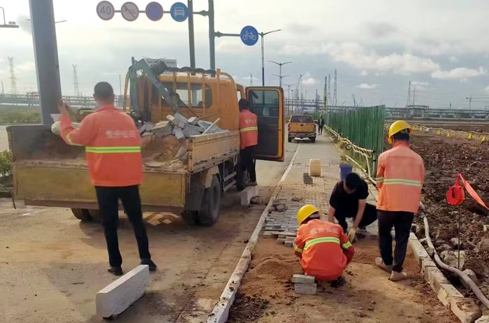走进新区石化十路一处施工现场,“市政尖兵们”正井然有序地对因施工车辆碾压造成人行步道地砖破损处进行修复。人工拆除原受损人行道地砖,对缺失路牙石进行补缺并压实整平基础、定位放线、更换面包砖和盲道砖,经过2个多小时紧张施工,原坑坑洼洼的路面,取而代之是敞亮平整。多日来,默默无闻的市政“尖兵”们用勤劳的双手加速施工进程,用实干诠释徐圩悦升市政人的新风采。目前,已完成徐圩大道、云河路等10条主次干道两侧人行道集中巡检修补工作,共整治32处,更换面包砖约96平方米、路缘石33米、盲道地砖11平方米。
